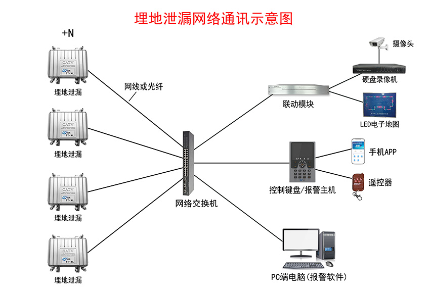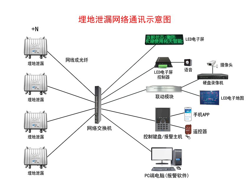 埋地泄漏入侵報(bào)警系統(tǒng)示意圖——網(wǎng)絡(luò)通訊+LED電子屏+語(yǔ)音