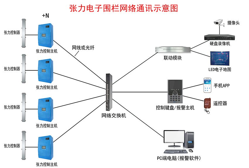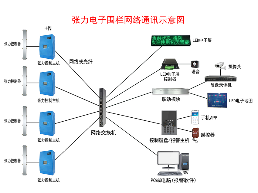 張力電子圍欄報警系統(tǒng)示意圖——網絡通訊+LED電子屏+語音