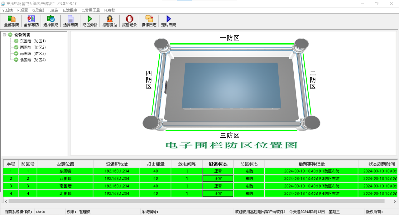 ● 功能:管理控制前端高壓電網(wǎng)主機、分控主機;實時監(jiān)控前端電網(wǎng)圍欄防區(qū)狀態(tài)以及對防區(qū)參數(shù)設(shè)定;支持報警信息、軟件操作信息查詢導(dǎo)出